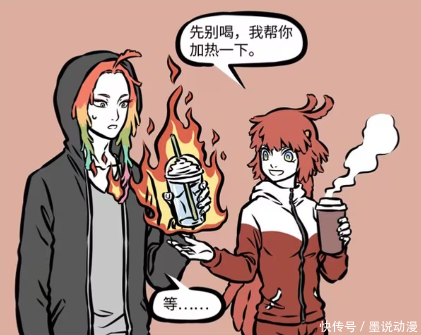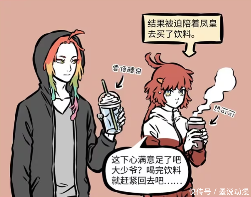 凤皇难得能够好好逛一逛,朱雀发现他之后,也被迫陪他逛街买饮料。因为凤凰的设定是非梧桐不栖,非醴泉不饮,所以凤皇买的饮料是雪顶醴泉。至于朱雀,就没有这种要求,所以她买了一杯热可可。