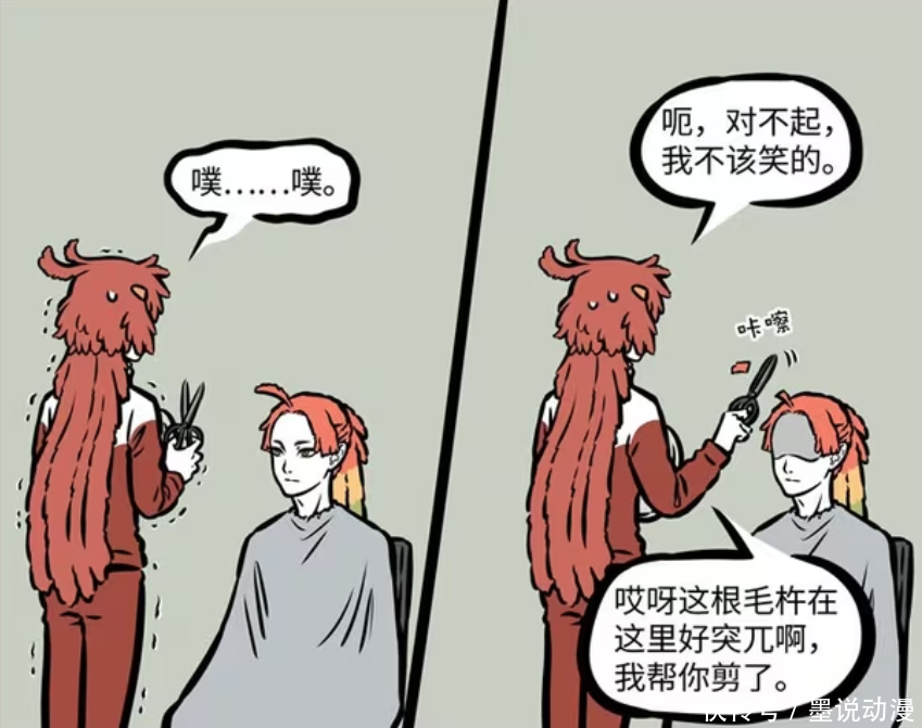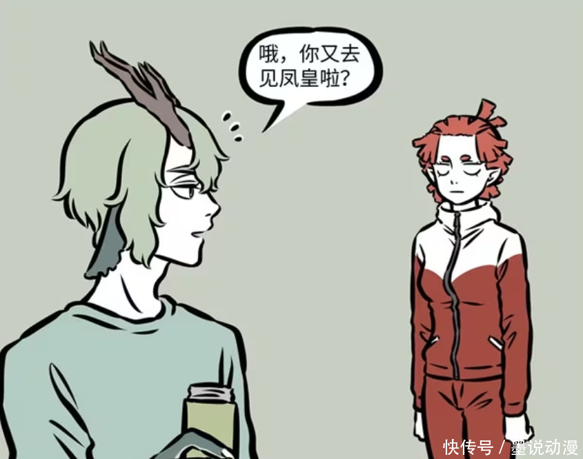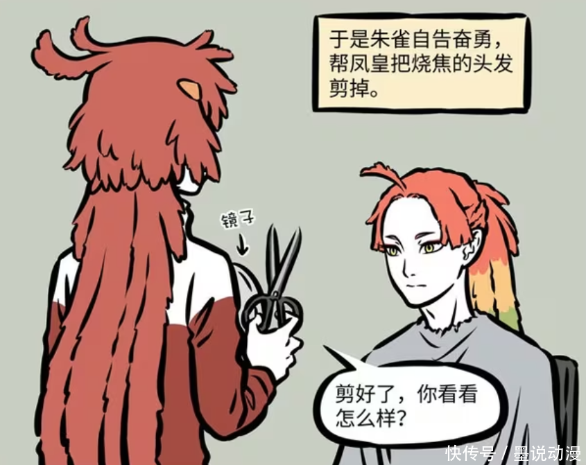 《非人哉》漫画版,凤皇好不容易偷溜出来,朱雀陪他逛街。因为朱雀没有控制好火焰,不仅烧了凤皇的饮料,还烧了他的头发。凤皇被迫换发型,新造型让颜值有所下降。凤皇气不打一处,亲自剪掉朱雀的长发。