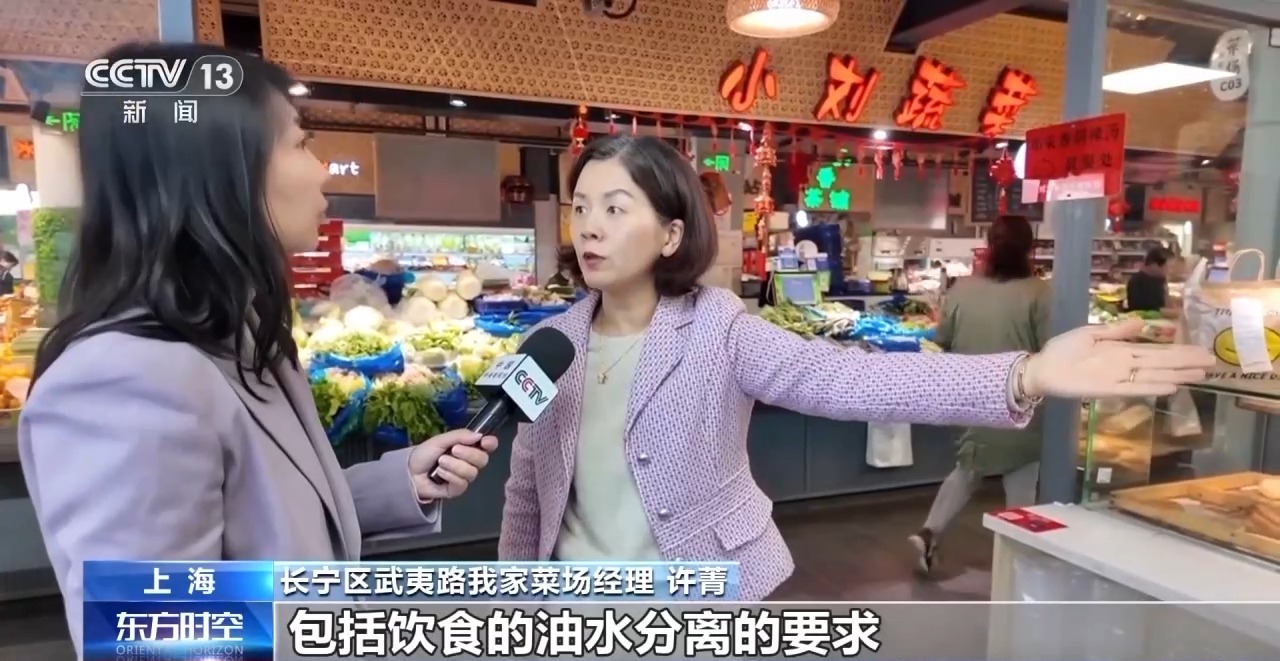 长宁区武夷路我家菜场经理 许菁:原来我们是有柜台,还有一堵墙,现在我们把柜台也打掉了,墙也打掉了,所有上面的吊顶能够做到一体化,满足消防喷淋的要求,包括饮食的油水分离的要求,我们都是在最小的一个范围内能够做到最好的展示。
